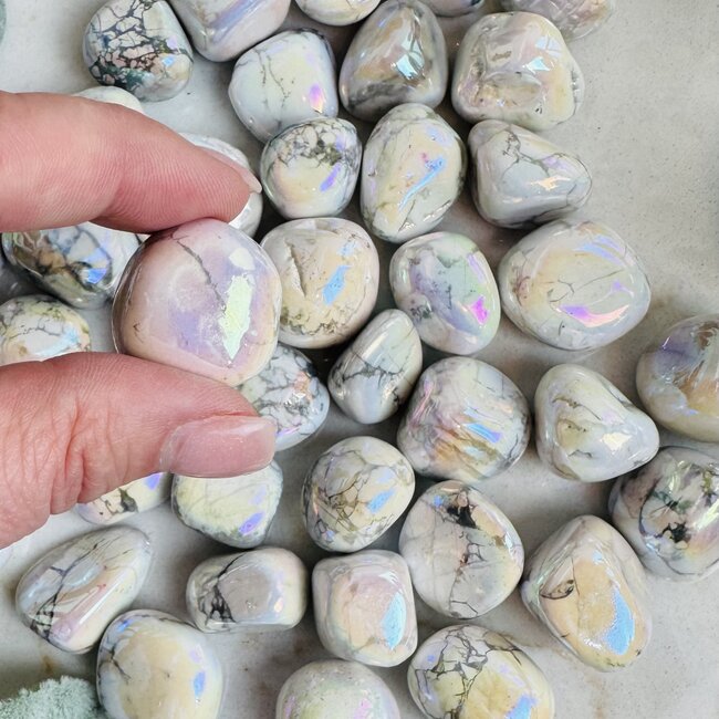 Angel Aura White Howlite (Magnesite) combines the naturally soothing energy of Howlite with an iridescent aura coating that enhances its frequency, creating a stone that supports peace, emotional clarity, and higher awareness Read more.