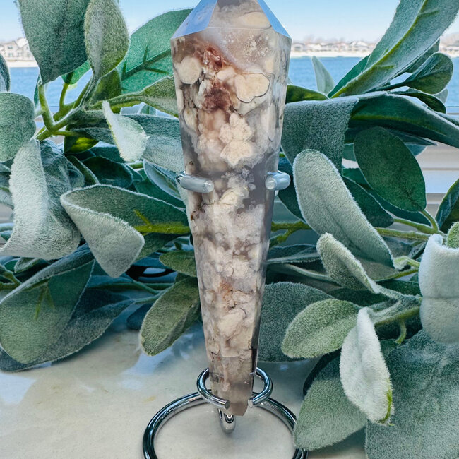 This Black Flower Agate faceted wand is a statement piece of strength and transformation. Standing approximately 7–8 inches tall on a sleek silver pin stand holder, this crystal combines striking beauty with concentrated, directional energy. The faceted finish enhances both its visual depth and its ability to focus intention.