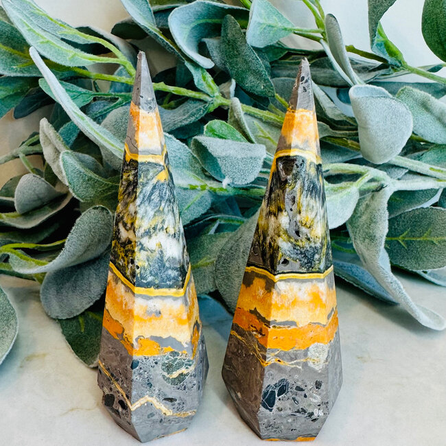 Each Bumblebee Jasper tower at Awakenings is ethically sourced and carefully selected for its quality, energy, and visual impact. Your piece also comes with an informational card explaining its properties and uses so you can fully connect with its energy.