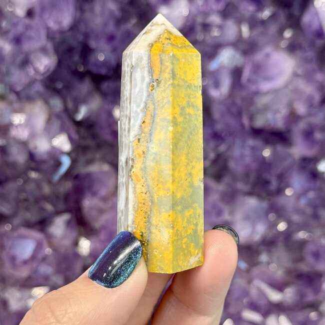 Ignite creativity, confidence, and purpose with these striking Bumblebee Jasper towers. Ethically sourced and polished into powerful generator points, each piece displays vivid bands of yellow, orange, and charcoal—natural patterns formed by volcanic activity. These towers are not just visually captivating; they are energetic catalysts for growth, passion, and action.