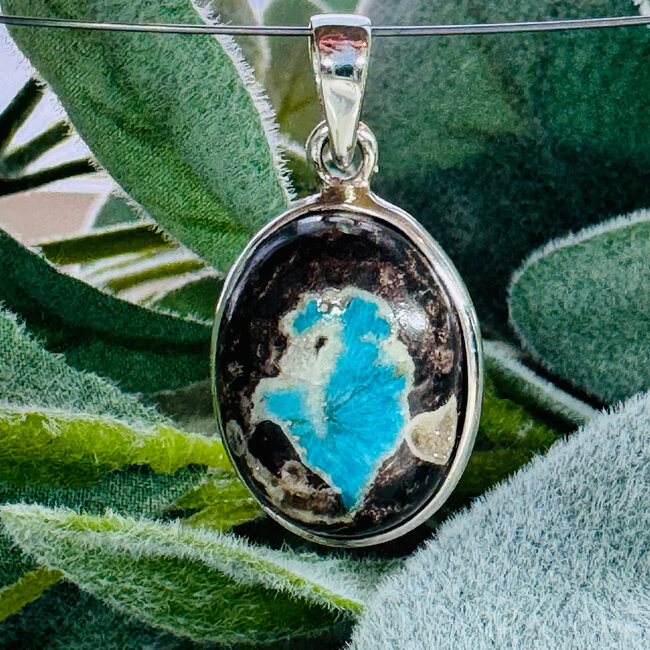 Cavansite is a stone that immediately captures attention with its vivid, electric blue crystalline formations. Set in a sleek sterling silver oval bezel, this pendant is both striking and energetically powerful. It is a crystal for insight, higher learning, and rapid spiritual growth.