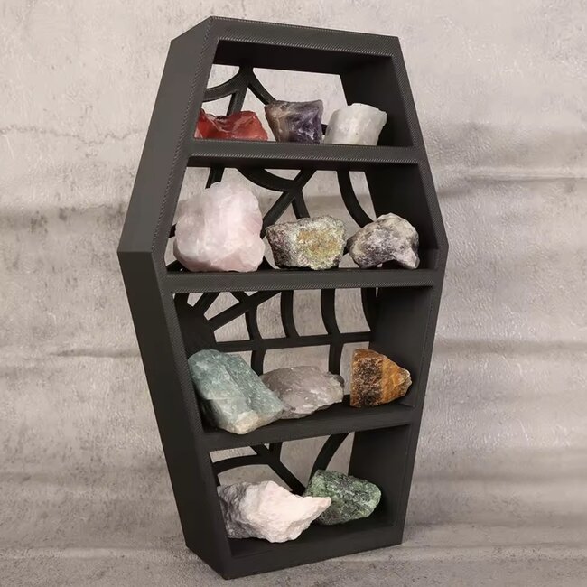 The coffin shape symbolizes transformation, protection, and rebirth, making it especially fitting for spiritual practitioners, collectors, and lovers of alternative décor. Use it to intentionally display crystals, tarot decks, pendants, rings, spell tools, or keepsakes, turning everyday storage into a visually powerful focal point. Its deep black finish enhances the natural beauty of crystals and metals, creating dramatic contrast that elevates any space.