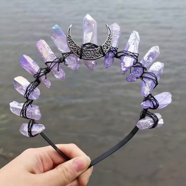 Purple Aura Quartz Tiara Crown - Rough Points Silver Plated Crescent Moon - Crystal Headband Hair Accessories