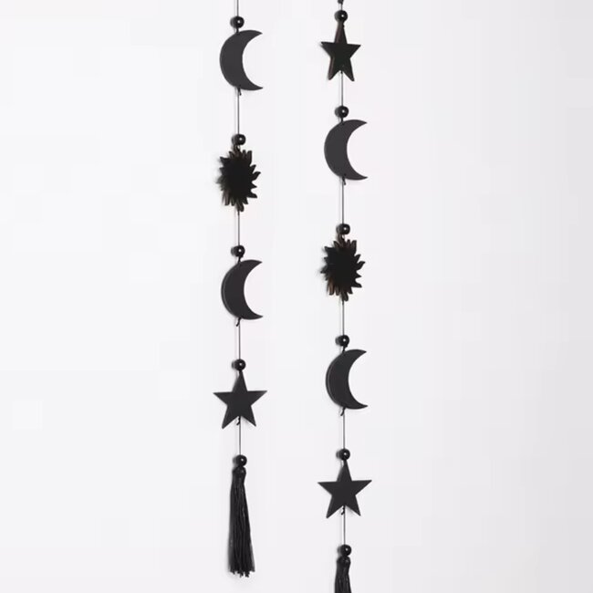 Black Moons, Suns & Stars Wooden Wall Hanging with Tassel Decor - Boho Home Decoration