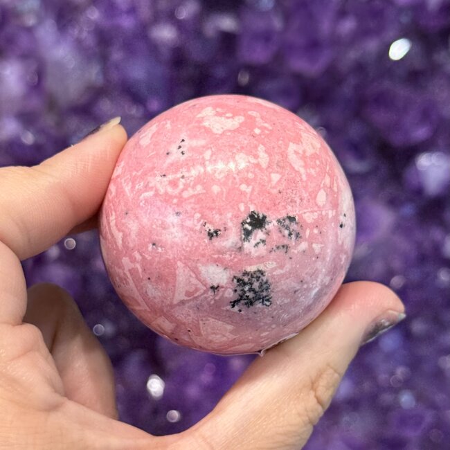 Invite compassion, balance, and emotional renewal into your life with our Peruvian Rhodonite Sphere Orb (50mm). Hand-polished from high-quality, ethically sourced Rhodonite, this sphere showcases rich pink tones intertwined with grounding black veining—a natural expression of harmony, healing, and heart-centered strength.