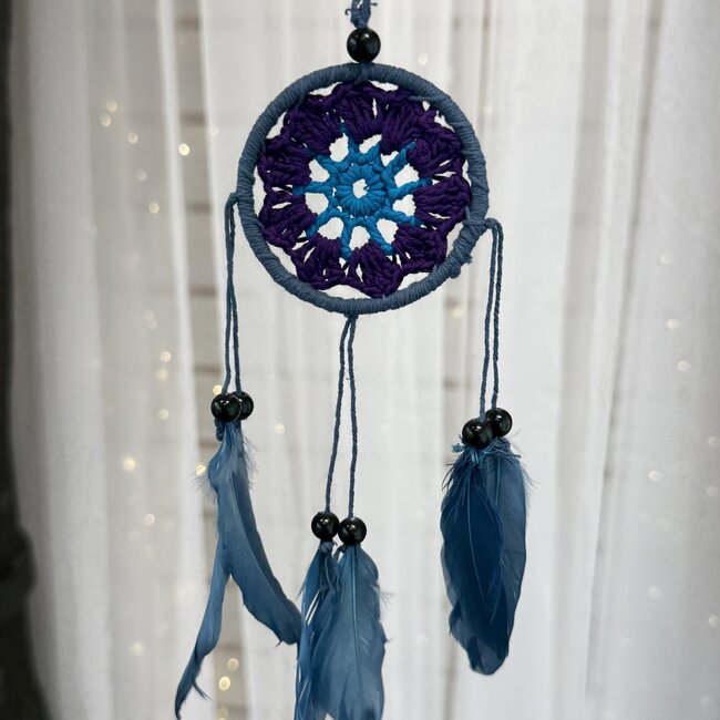 The intricate crochet center symbolizes the web of protection — traditionally believed to filter out unwanted energies while allowing peaceful dreams and positive intentions to flow through. The calming blue hues encourage emotional balance and relaxation, while the purple detailing reflects intuition, higher awareness, and inner wisdom. Soft blue feathers gently move with the air, promoting a sense of lightness and energetic flow.