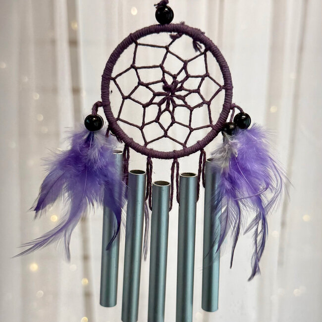 Dreamcatchers are believed to protect against unwanted energy, allowing positive dreams, insight, and intention to pass through. The purple color is closely associated with intuition, spiritual awareness, and inner wisdom, making this dreamcatcher ideal for meditation spaces, bedrooms, or sacred areas where clarity and higher connection are desired. The flowing purple feathers bring softness and movement, while the five metal chimes create a gentle, cleansing tone that helps shift stagnant energy and refresh the atmosphere.