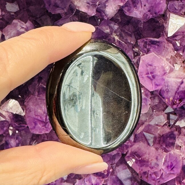 Hematite is an iron oxide mineral with a natural metallic sheen and dense, grounding energy. Its smooth surface makes it ideal for worry stones, allowing you to hold and rub it comfortably while meditating, working, or relaxing.