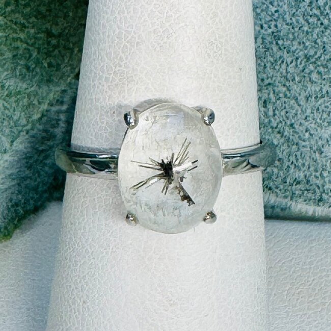 Each Hollandite in Quartz stone is ethically sourced and selected for its distinctive starburst inclusions and clarity. Because these formations are completely natural, no two rings are ever alike. The sterling silver adjustable claw prong setting offers durability while allowing the stone’s full beauty and energy to remain exposed.