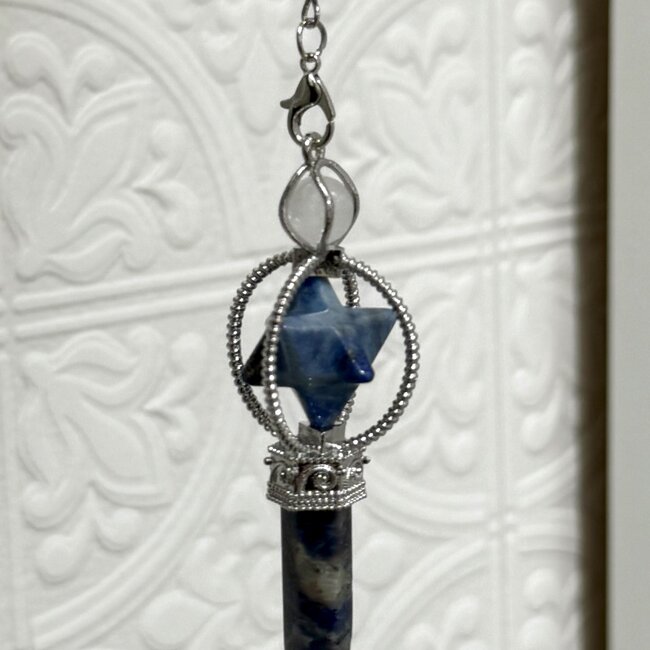 The spinning Merkaba symbolizes sacred geometry and the light body, allowing energy to flow dynamically during readings. The Sodalite point sharpens logic, truth, and intuitive reasoning, while the Clear Quartz sphere acts as an amplifier—magnifying intention, accuracy, and energetic transmission. Together, these elements create a pendulum that is both beautifully balanced and exceptionally responsive.