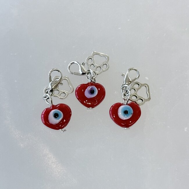 This thoughtfully designed piece features a vibrant red Evil Eye set within a heart, paired with a delicate paw charm—uniting protection with unconditional love. The Evil Eye has long been used as a powerful talisman to deflect negativity, envy, and unwanted energy, while the red color is often associated with vitality, strength, courage, and life force energy. Combined with the heart shape and paw detail, this charm becomes a beautiful reminder of the deep emotional bond and protective connection between you and your pet.