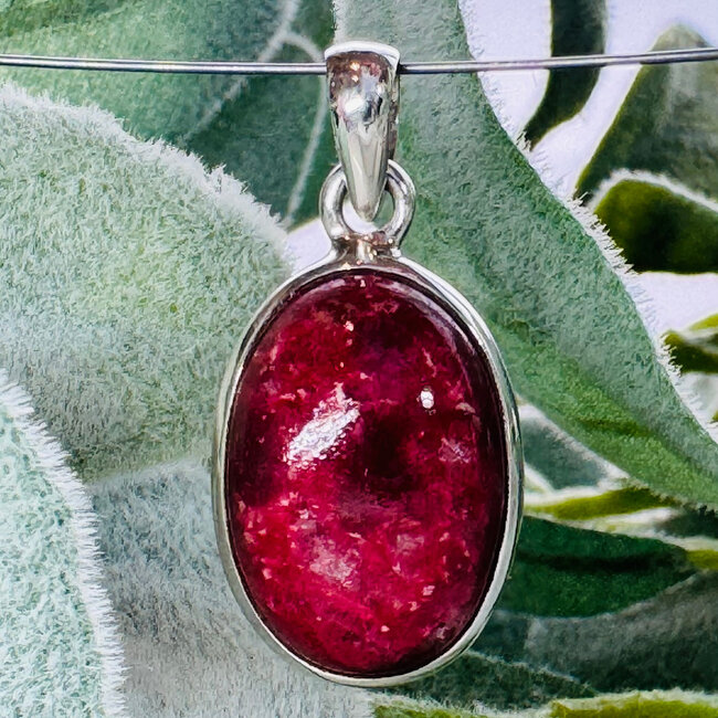 This Pink Thulite pendant radiates vibrant shades of rosy pink, beautifully framed in a polished sterling silver oval bezel. It is a stone of love in action—encouraging confidence, emotional expression, and the courage to live from the heart.