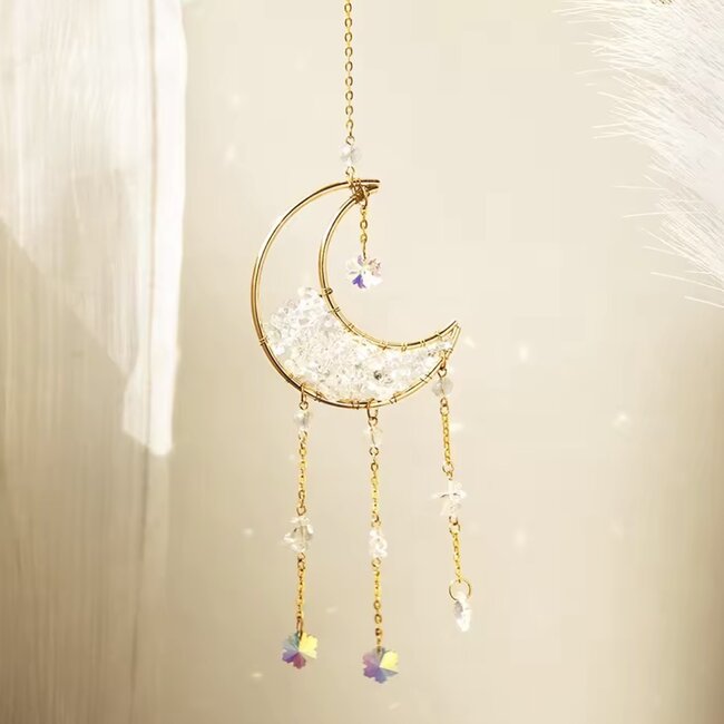 This Clear Quartz Prism Sun Catcher features a crescent moon design with faceted crystal prisms and gold accents, perfect for hanging in a window to transform sunlight into sparkling rainbows. Its elegant design not only enhances your décor but also radiates positive energy throughout your space.