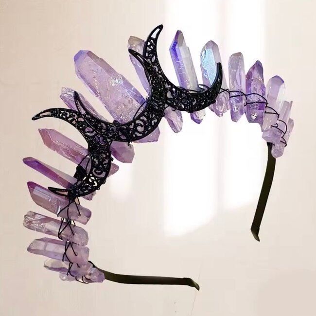 Embrace your mystical energy and make a bold statement with this Purple Aura Quartz Tiara Crown. Featuring natural rough quartz points and a striking black triple crescent moon design, this crystal headband blends ethereal beauty with powerful metaphysical benefits—perfect for rituals, meditation, or elevating any special occasion.