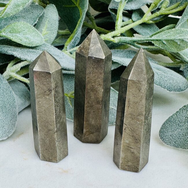 Each 1–3 inch tower showcases Pyrite’s natural metallic gold shimmer and geometric formations, polished to a pointed tip that directs energy with precision. Perfect for meditation, crystal grids, or display, these towers radiate a strong and uplifting energy wherever they are placed.