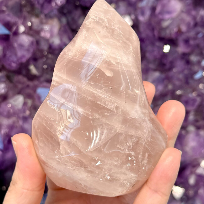 Graceful, radiant, and full of loving energy, this Rose Quartz Flame Point is a stunning symbol of compassion and transformation. Carved into a flowing 4-inch twist flame shape, this polished piece blends soft heart-centered energy with upward-moving intention—making it both a powerful energetic tool and a beautiful statement for your space.