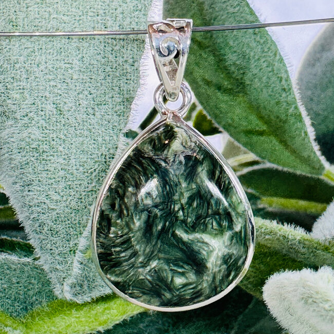 Each Seraphinite pendant is ethically sourced and carefully selected for its distinctive feather-like inclusions and vibrational quality. The sterling silver bezel setting protects and frames the stone while maintaining its natural beauty.