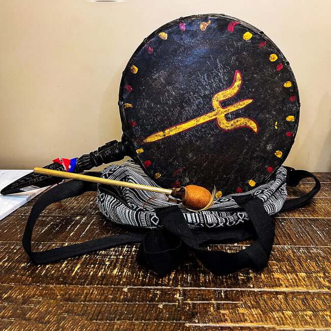 Spiritually, the Dhyangro drum is used to induce altered states of awareness, allowing the practitioner to journey between worlds, communicate with spirit allies, and restore energetic balance. The rhythmic beat helps synchronize the mind and body, opening pathways for deep meditation, ancestral connection, and shamanic travel. The included Phurbu-style handle adds an additional layer of symbolism, representing spiritual authority, protection, and the ability to cut through negative or intrusive energies.