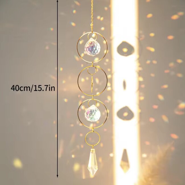 The faceted rainbow crystals are cut to catch and scatter light into colorful prisms, symbolically breaking dense energy into lighter, more harmonious frequencies. Many people hang sun catchers in areas where they want to increase positivity, creativity, and flow — such as living rooms, offices, meditation spaces, or entryways.