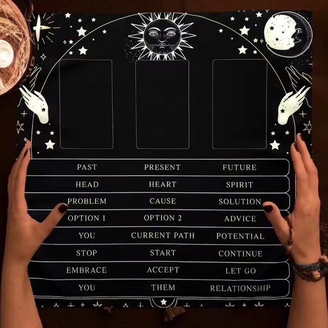 Create a focused, intentional space for your readings with this beautifully designed Past, Present & Future Tarot Spread Altar Cloth. Featuring a striking black and white Sun, Moon, and Stars design, this cloth blends timeless symbolism with practical guidance, making it perfect for tarot, oracle, and divination work.